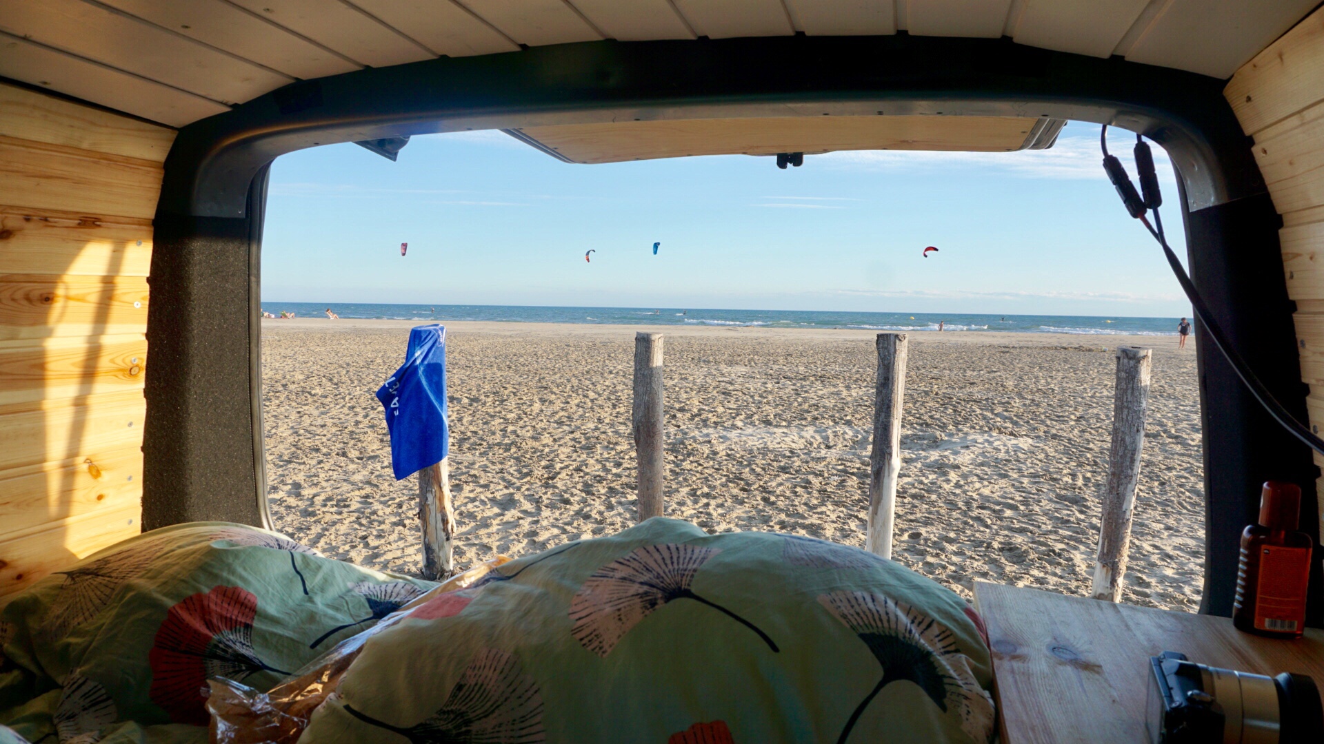Wir haben die Sache sehr entspannt betrachtet, da wir um unser Ziel des nächsten Tages wussten. Nach einem kurzen Zwischenstopp am Morgen bei McDonalds zum Waschen ging es für uns weiter zum Plage de Piémanson. Rømø 2.0, bis auf die Flamingos am Straßenrand! Wir standen mit dem Bus weniger Meter vom Mittelmeer direkt im Strandsand und so haben wir den Tag verbracht: Sonnen, baden, lesen, essen, Vino und von vorne! Das ist der Platz zum runterkommen und für alle Kiter unter Euch: es herrschten die perfekten Windbedingungen und es waren nur eine Handvoll Surfer auf dem Wasser.